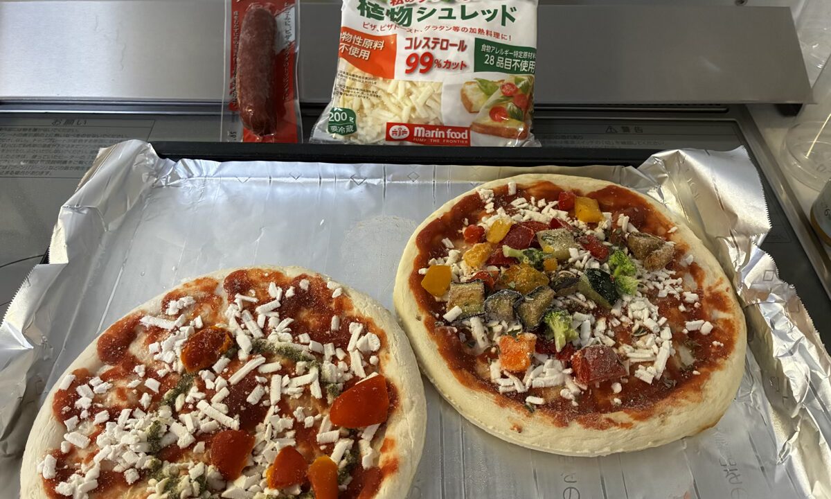 無印良品の冷凍ピザを2種類。トマトとバジルのピザと、彩り野菜のピザだ。